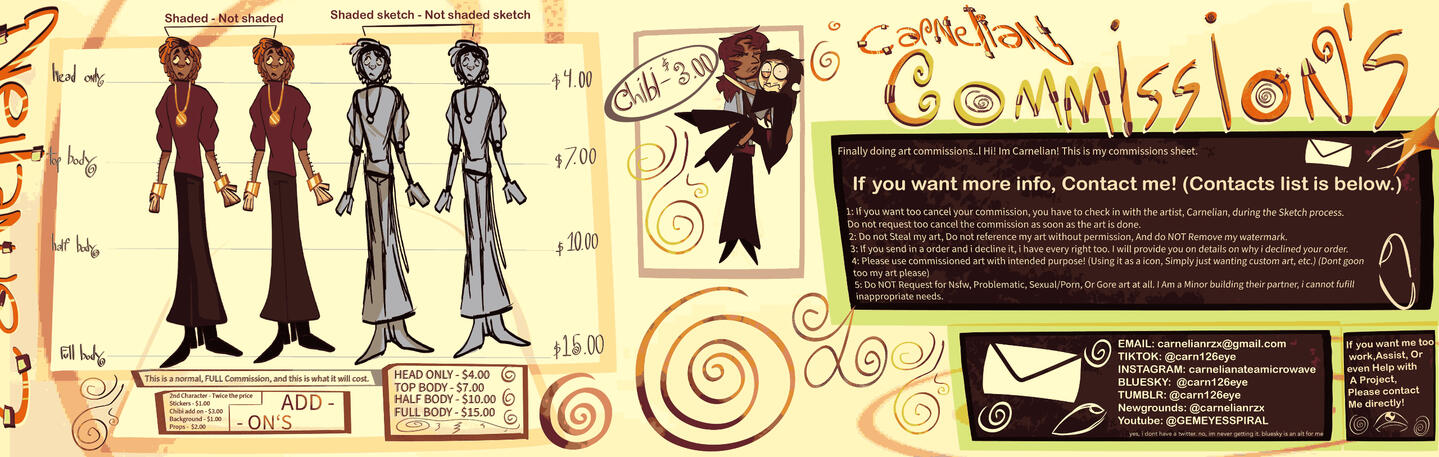 Before asking for a commission, Read the rules.RULES:1: If you want too cancel your commission, you have to check in with the artist, Carnelian, during the Sketch process. Do not request too cancel the commission as soon as the art is done.2: Do not Steal my art, Do not reference my art without permission, And do NOT Remove my watermark.3: If you send in a order and i decline it, i have every right too. I Will provide you on details on why i declined your order tho!4: Please use commissioned art with intended purpose! (Using it as a icon, Simply just wanting custom art, etc.) (Dont goon too my art please)5: Do NOT Request for Nsfw, Problematic, Sexual/Porn, Or gore art at all. I Am a Minor building their platform, i cannot fuffil inappropriate nerds.