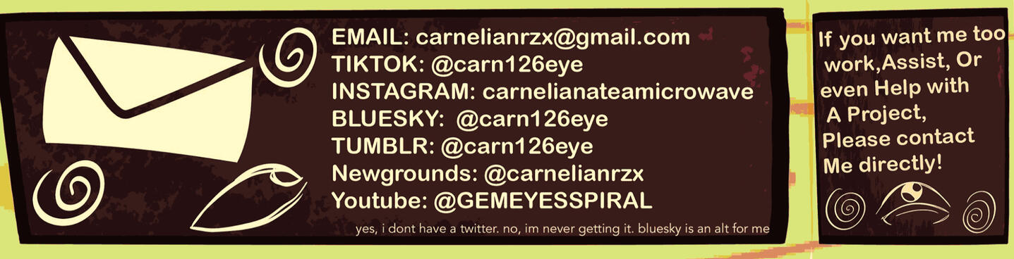 Hii! Im Carnelian. Creator of Test126eye and Designer for Detective on the case. Im a Freelance Cartoonist, Artist, Animator-hybrid-thing and i am happily open too commissions.